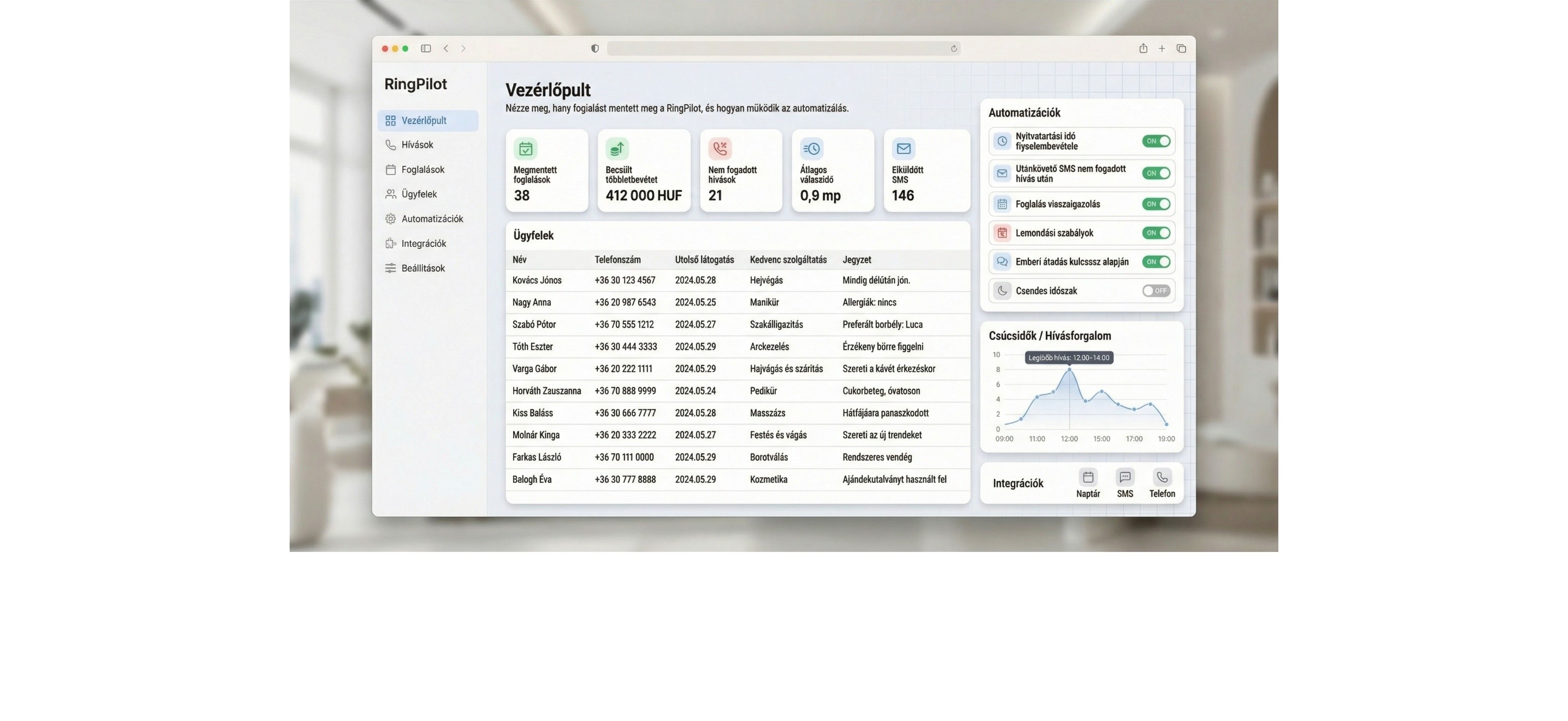 Answers customer calls with natural Hungarian voice, collects booking details, and transfers to you if needed. Handles every call, even after hours or when you’re busy.